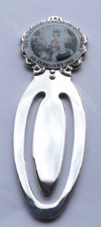 Keep your place with this Queen Elizabeth Platinum Jubilee bookmark. Featuring Her Majesty Queen Elizabeth in Coronation pose, with Crown and Sceptre, set on a silver coloured bookmark.